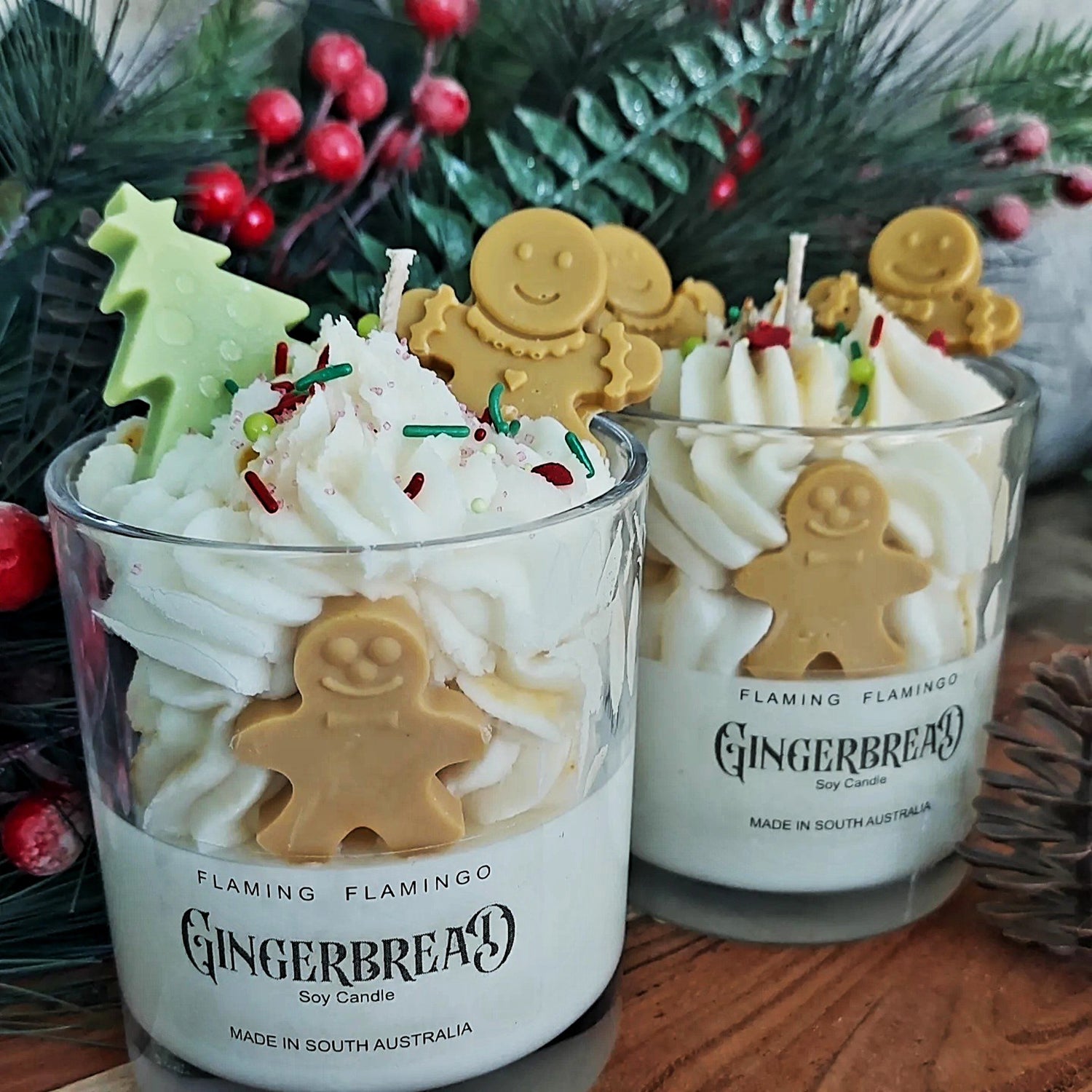 Each candle is hand-poured and beautifully topped with whipped soy wax, festive sprinkles, and adorable gingerbread people — making it as sweet to look at as it is to smell!